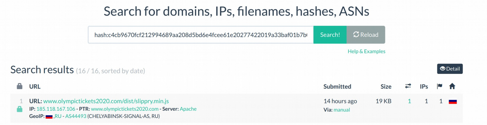 Since the altered Slippry did not load from a third-party location that could have been compromised, Pimental searched for the hash of the library on UrlScan and found that it was present on another site, EuroTickets2020.com, also in the ticket reselling business.