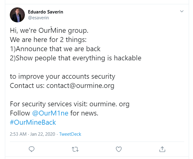 OurMine took a break from media attention in 2017 but on January 22 they started to claim the spotlight again by hacking Twitter accounts of users flush with followers.
