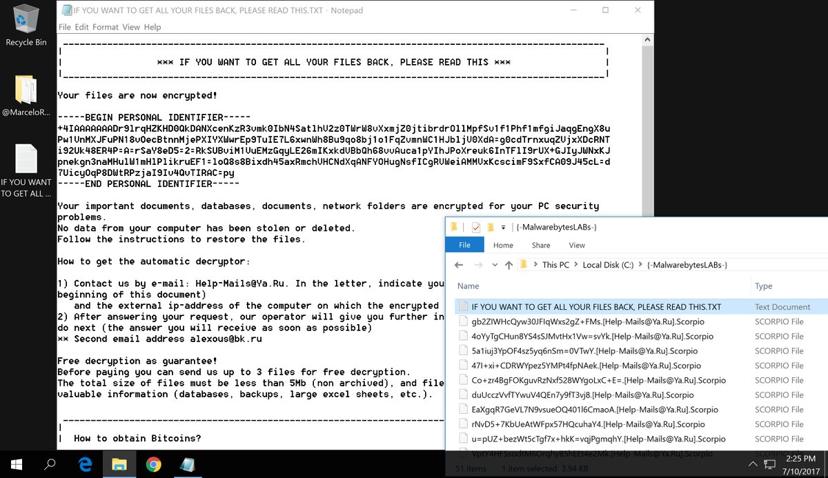 Malwarebytes malware researcher Marcelo Rivero discovered a new version of the Scarab ransomware was found called Scorpio. The Scorpio ransomware will append the [Help-Mails@Ya.Ru].Scorpio extension to encrypted files and drops a ransom note named IF_YOU_WANT_TO_GET_ALL_YOUR_FILES_BACK_PLEASE_READ_THIS.TXT.