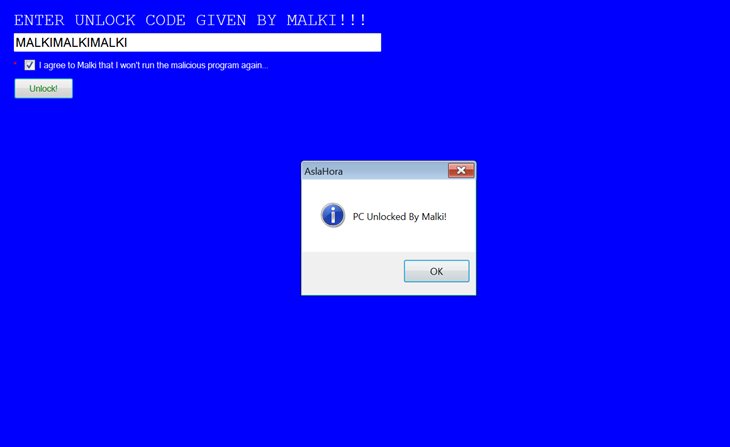 Malwarebytes security researcher Marcelo Rivero discovered a new HiddenTear variant called AslaHora Ransomware. This ransomware appends the .Malki extension to encrypted files and has an unlock code of MALKIMALKIMALKI.