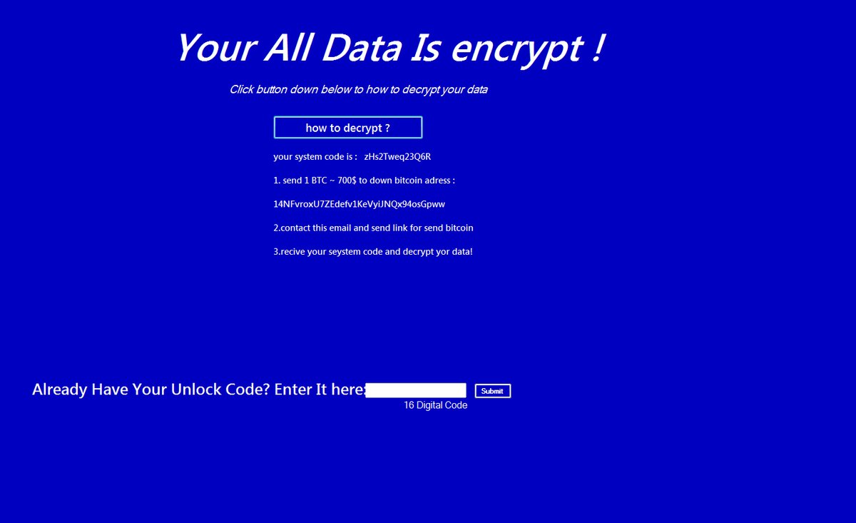 MalwareHunterTeam discovered a new fake screenlocker that someone created as a joke. The passcode is A01B.