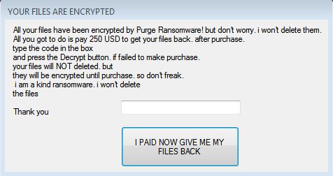 GData security researcher Karsten Hahn discovered the Purge Ransomware. This ransomware is buggy and crashes due to only decrypting a test folder. Appends the .purge extension to encrypted files. The unlock code is TotallyNotStupid.